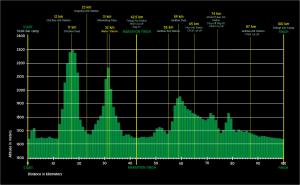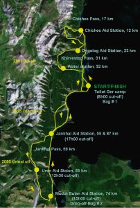 For the 100 km course, the route continues along the lake to the south-west, following a mostly flat dirt trail for 15 km, then ascends Jankhai Pass at just under 2,000 meter elevation. From Jankhai Pass, the course is primarily a gentle downhill over trails and unpaved single-track roads, with the final 25 km (15 miles) level along the lakeshore. The elevation gain (see the Elevation Chart) for the marathon distance is around 1,400 meters (4,600 ft) and for the 100 km it is around 2,120 meters (6,955 ft). Lowest elevation is 1645 meters (5,400 ft) and highest elevation is 2,300 meters (7,550 ft). The cut-off time for the ultra-marathon is 18 hours.